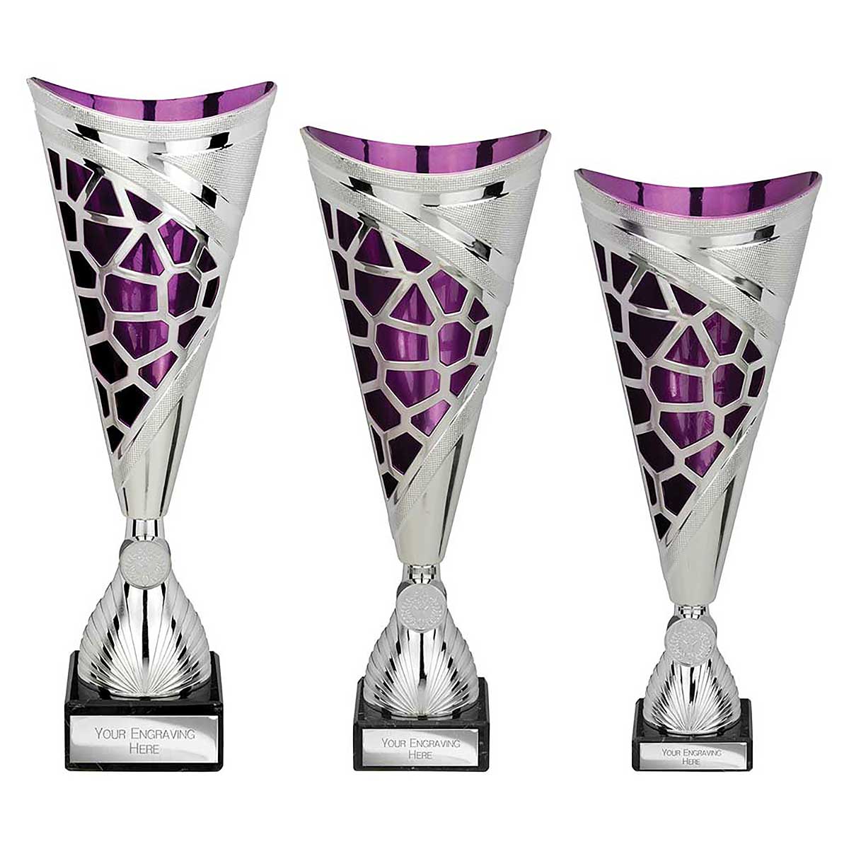 Purple Vivid Cup Trophy 365mm high Detailed plastic laser cut design on a black stone base Engraving plate and club badge can be applied to the front