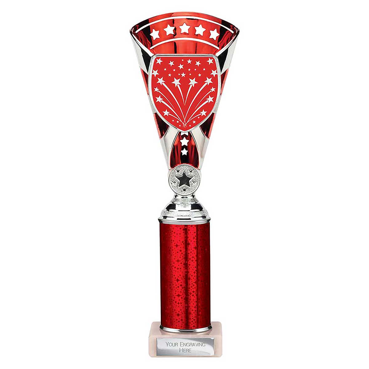 Red Silver Cobra Cup Trophy 305mm Star design sticker on the front of the cup with sparkly column and stone base A custom sticker, engraving plate and club badge can be applied to the front