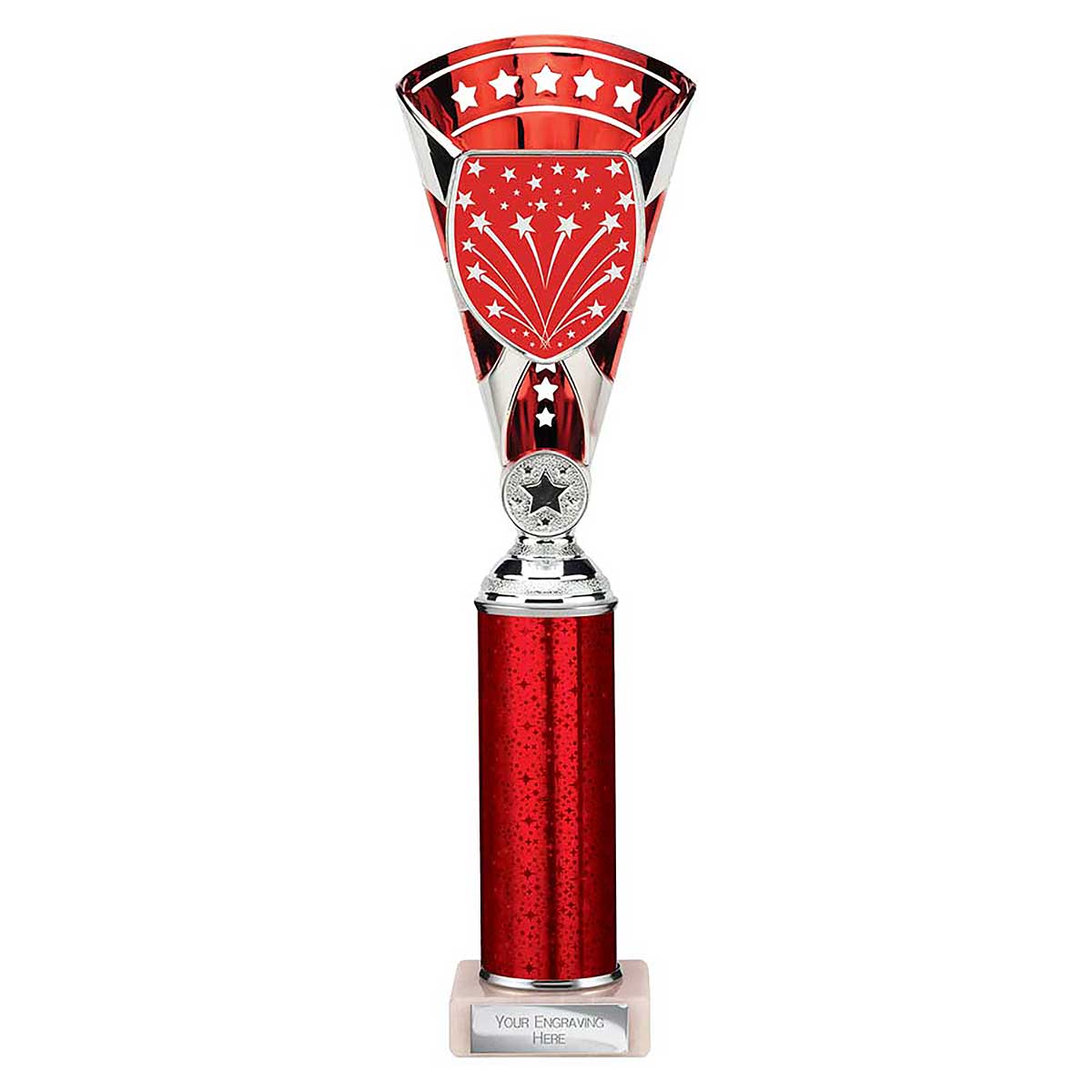 Red Silver Cobra Cup Trophy 330mm Star design sticker on the front of the cup with sparkly column and stone base A custom sticker, engraving plate and club badge can be applied to the front