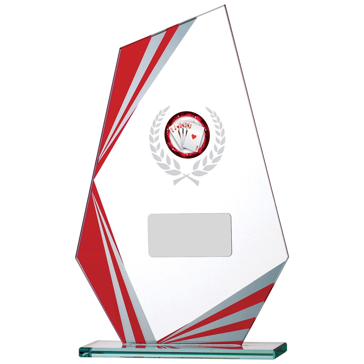 Red Mirror Edge award 205mm highAngular clear glass award with red and silver detailStands on a rectangular basePrice excludes engraving
