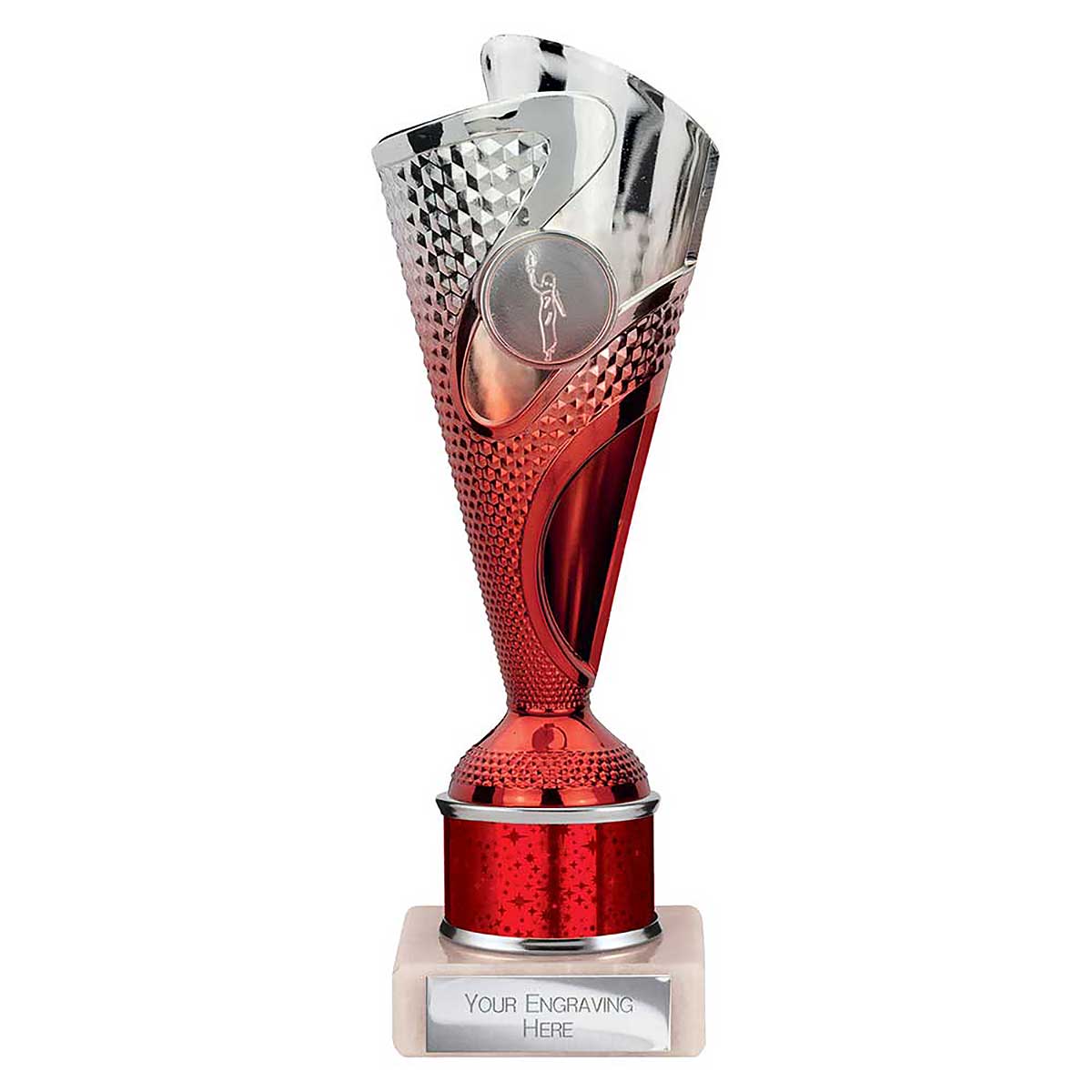Red Silver Rodeo Multsport Award 215mm high Modern design plastic flute on a sparkly column and stone base Engraving plate and club badge can be applied to the front