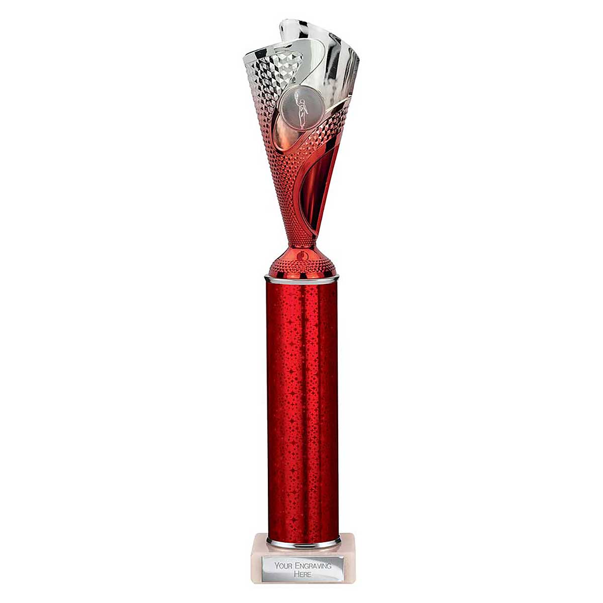 Red Silver Rodeo Multsport Award 365mm high Modern design plastic flute on a sparkly column and stone base Engraving plate and club badge can be applied to the front