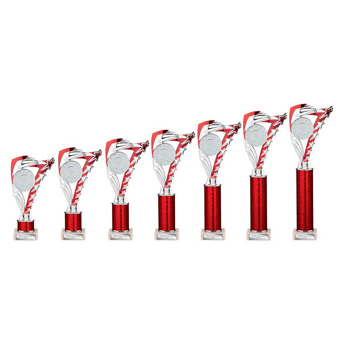 Red and silver Super Frenzy Multisport Trophy 340mm high Moulded plastic design on a glitter column and stone base Engraving plate and club badge can be applied to the front