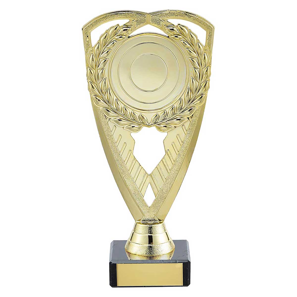 Sao Paulo Multisport Trophy 185mm highGold plastic design on a black marble baseEngraving plate and club badge can be applied to the front