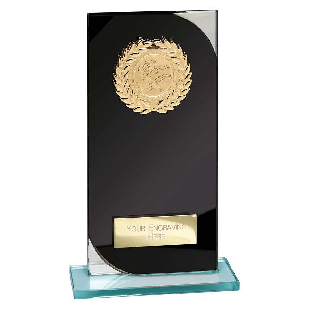 Seismic Black Mirror Glass Multisport award 190mm high. Silver 4mm glass backing with 4mm bonded colour layerEngraving plate and badge can be applied to front