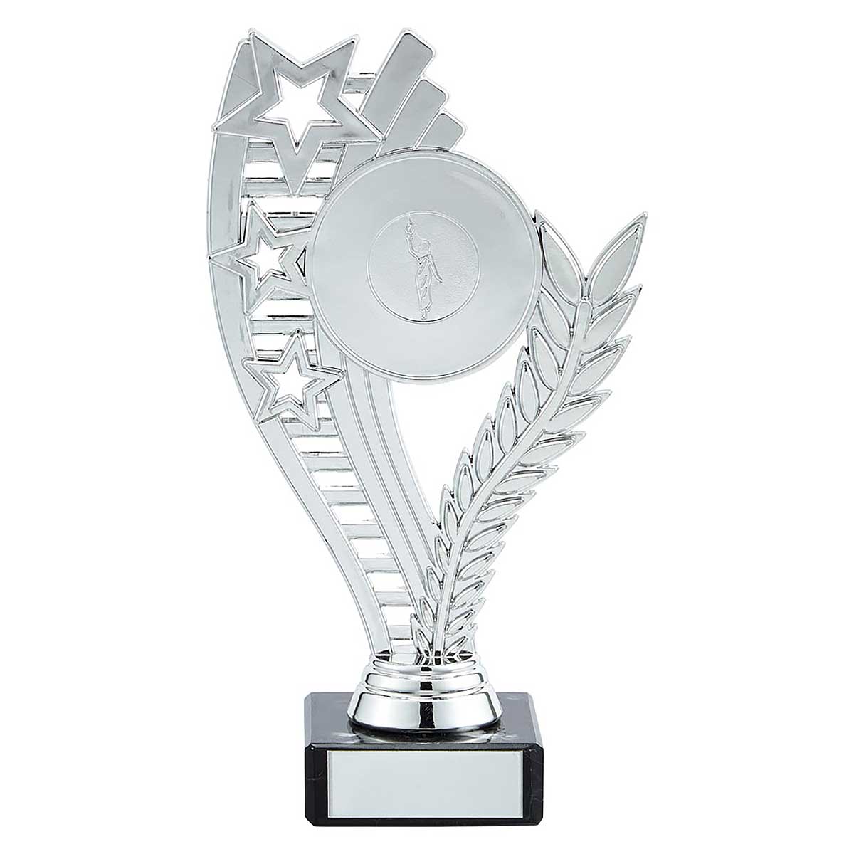 Silver Athena Multisport Trophy 185mm highSilver plastic design on a black marble baseEngraving plate and club badge can be applied to the front