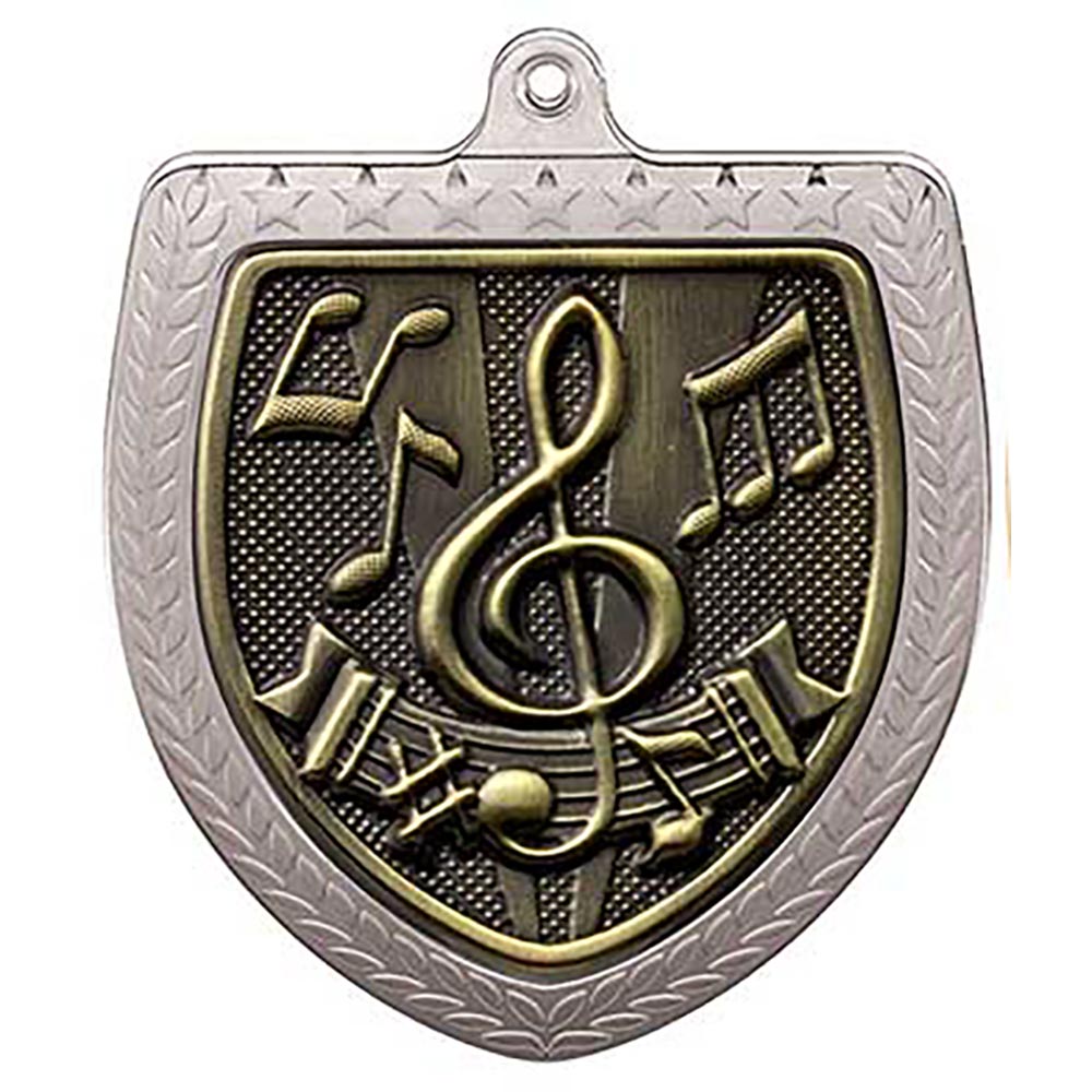 Silver Cobra Shield Music Medal 70mm at widest diameter 75mm highFeatures gold fascia to frontView our ribbons page for your colour options