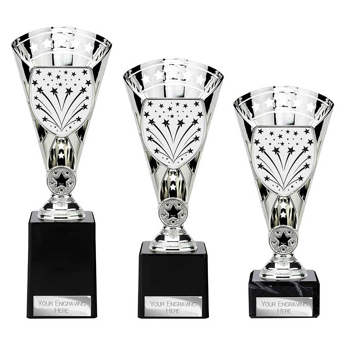 Silver Cobra Cup Trophy 210mm Star design sticker on the front of the black marble base A custom sticker, engraving plate and club badge can be applied to the front