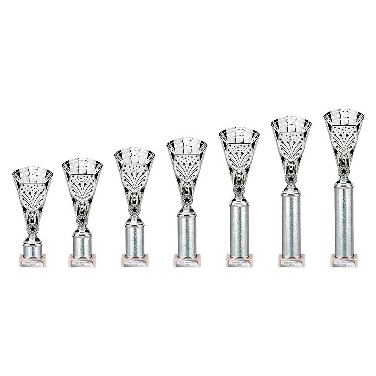 Silver Cobra Cup Trophy 230mm Star design sticker on the front of the cup with sparkly column and stone base A custom sticker, engraving plate and club badge can be applied to the front