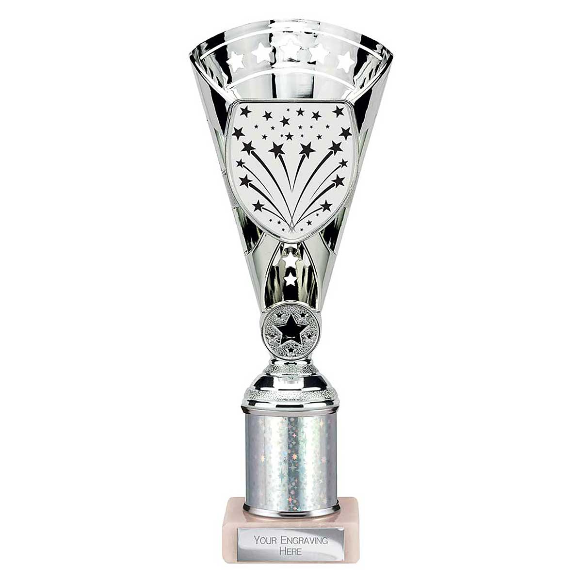 Silver Cobra Cup Trophy 255mm Star design sticker on the front of the cup with sparkly column and stone base A custom sticker, engraving plate and club badge can be applied to the front