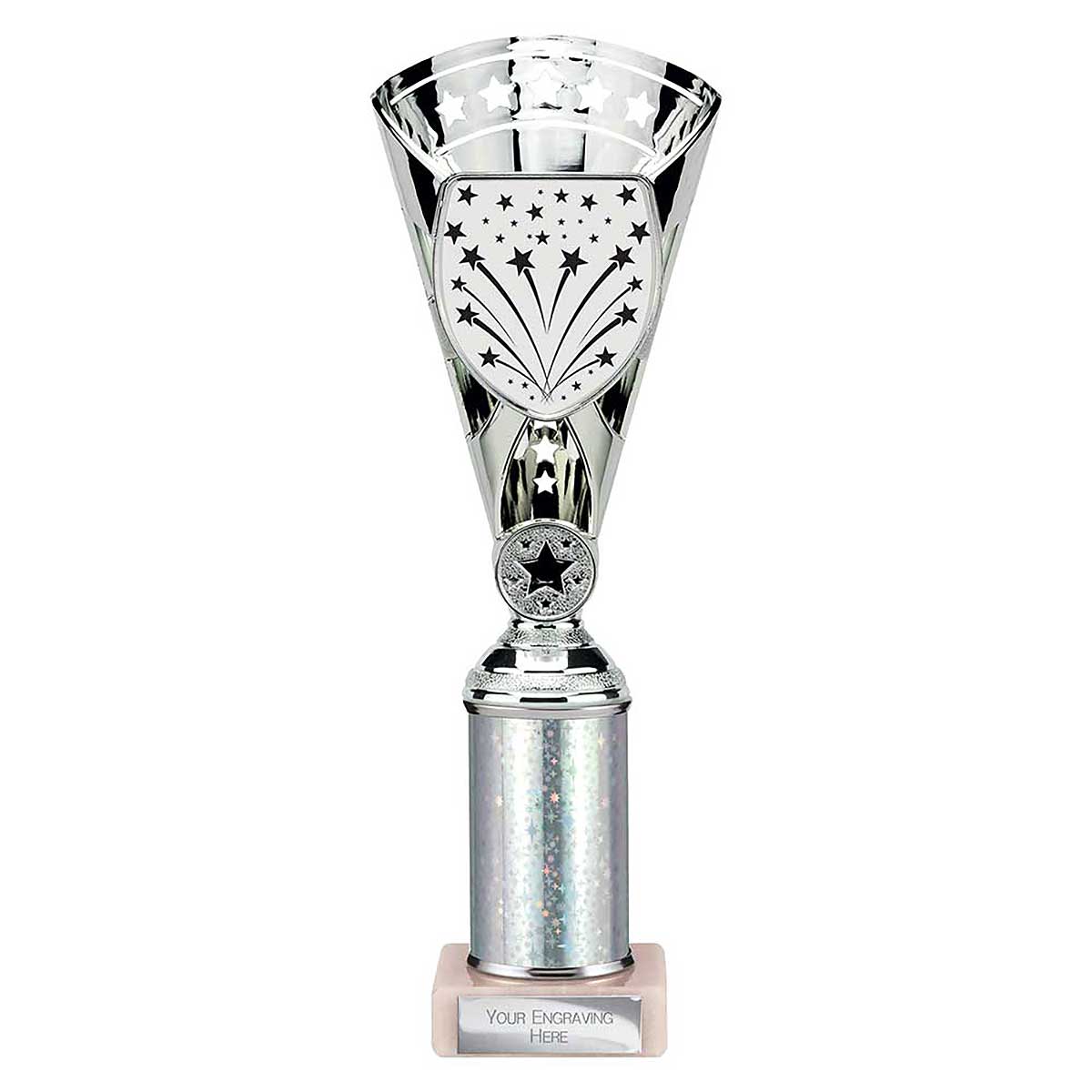 Silver Silver Cobra Cup Trophy 280mm Star design sticker on the front of the cup with sparkly column and stone base A custom sticker, engraving plate and club badge can be applied to the front