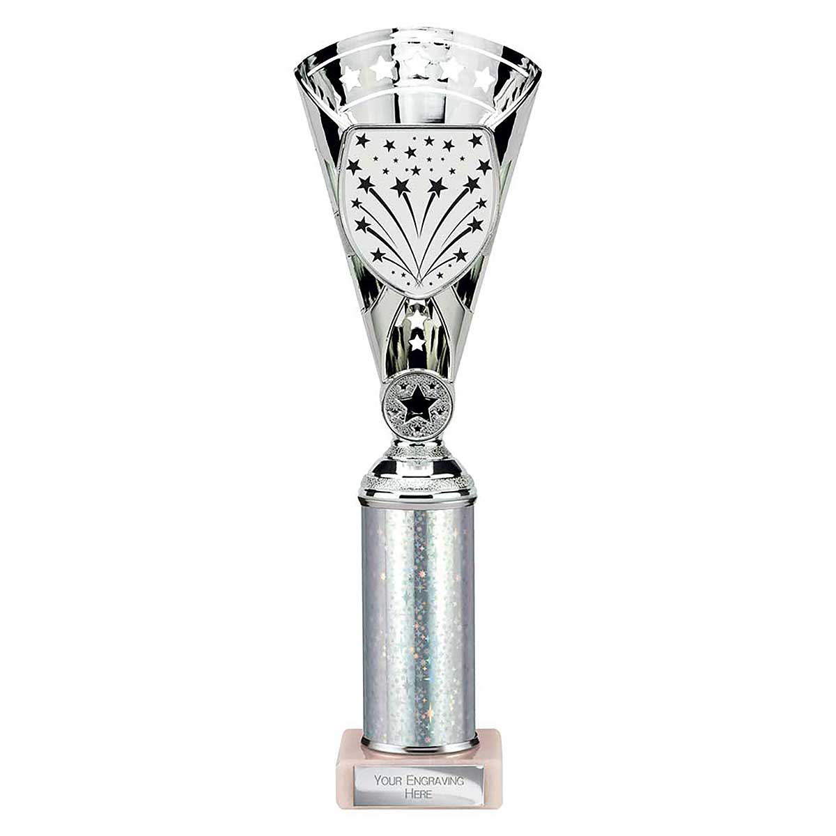 Silver Cobra Cup Trophy 305mm Star design sticker on the front of the cup with sparkly column and stone base A custom sticker, engraving plate and club badge can be applied to the front