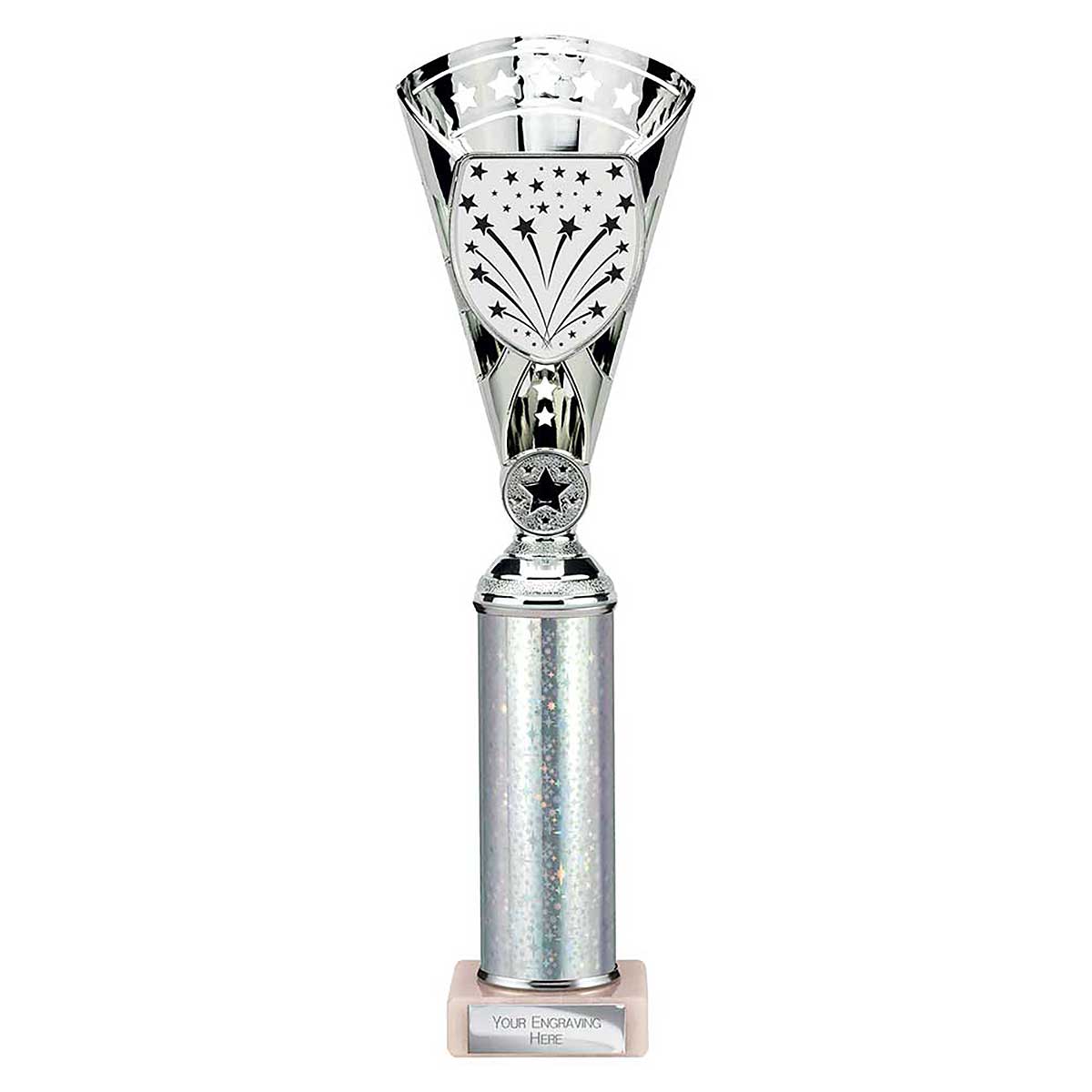 Silver Cobra Cup Trophy 330mm Star design sticker on the front of the cup with sparkly column and stone base A custom sticker, engraving plate and club badge can be applied to the front