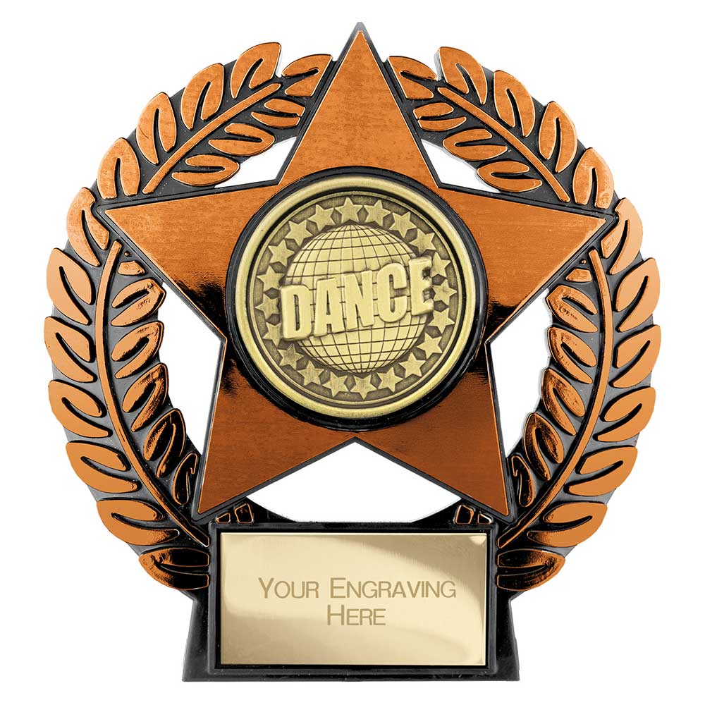 Bronze Emperor Star Dance Trophy 120mm high Features Bronze and black star with a surrounding laurel Engraving plate can be applied to the front