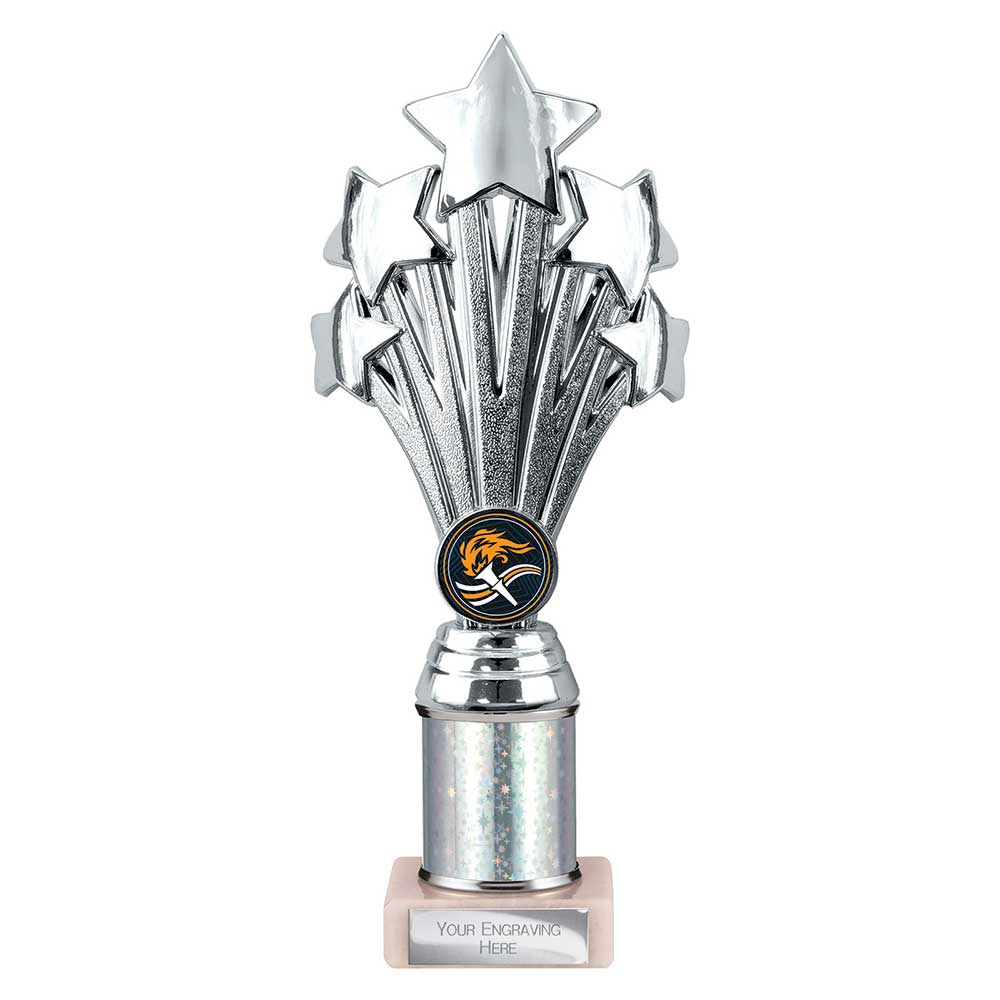 Silver 5 Star Trophy 240mm highSilver glitter superstar column on a stone baseEngraving plate and club badge can be applied to the front