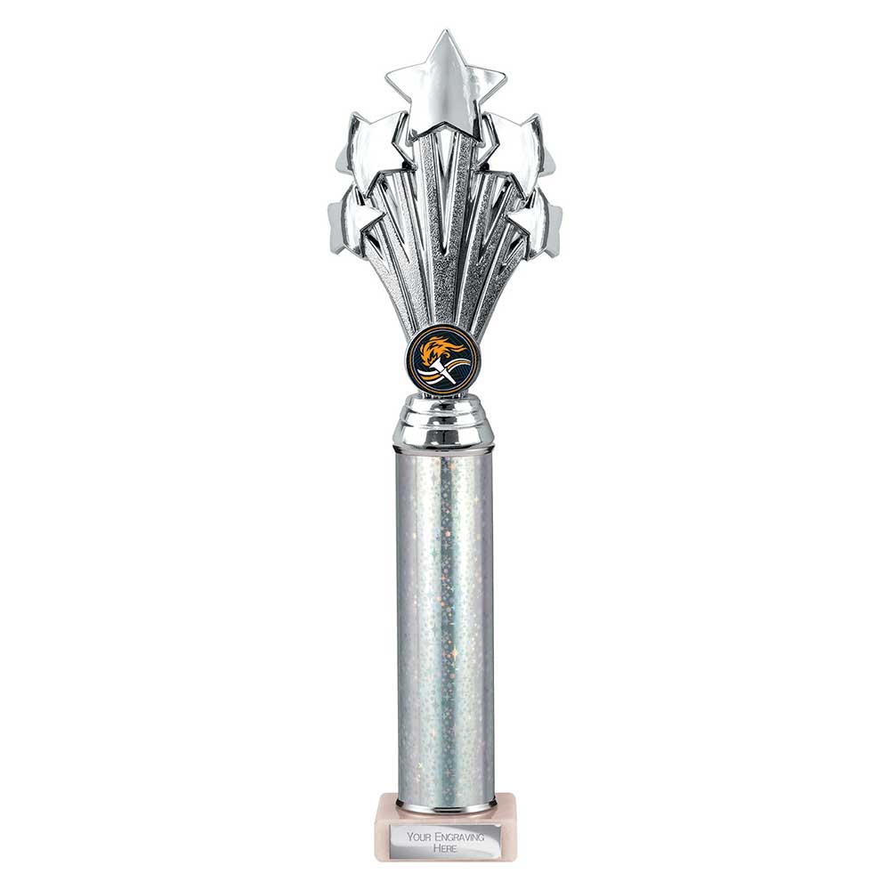 Silver 5 Star Trophy 365mm highSilver glitter superstar column on a stone baseEngraving plate and club badge can be applied to the front
