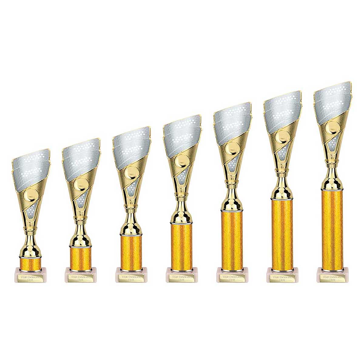 Silver and gold Predator multisport trophy 360mm high Detailed plastic cone design with glitter column & stone base Engraving plate and club badge can be applied to the front