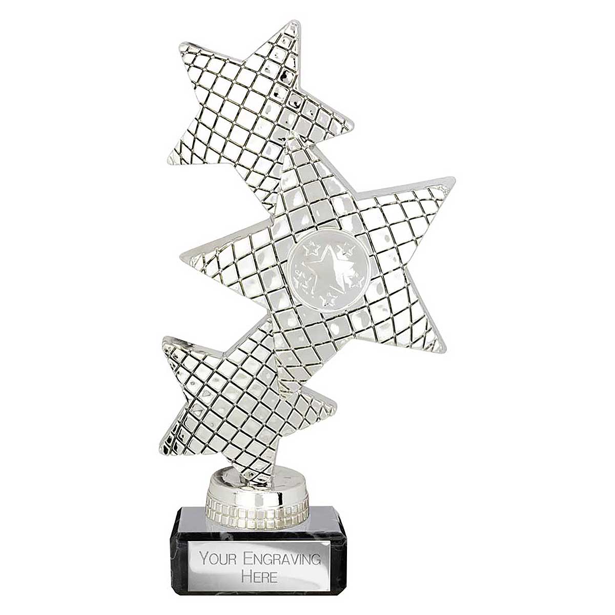 Silver Trinity Star Trophy 185mm highSilver plastic design on a black marble baseEngraving plate and club badge can be applied to the front
