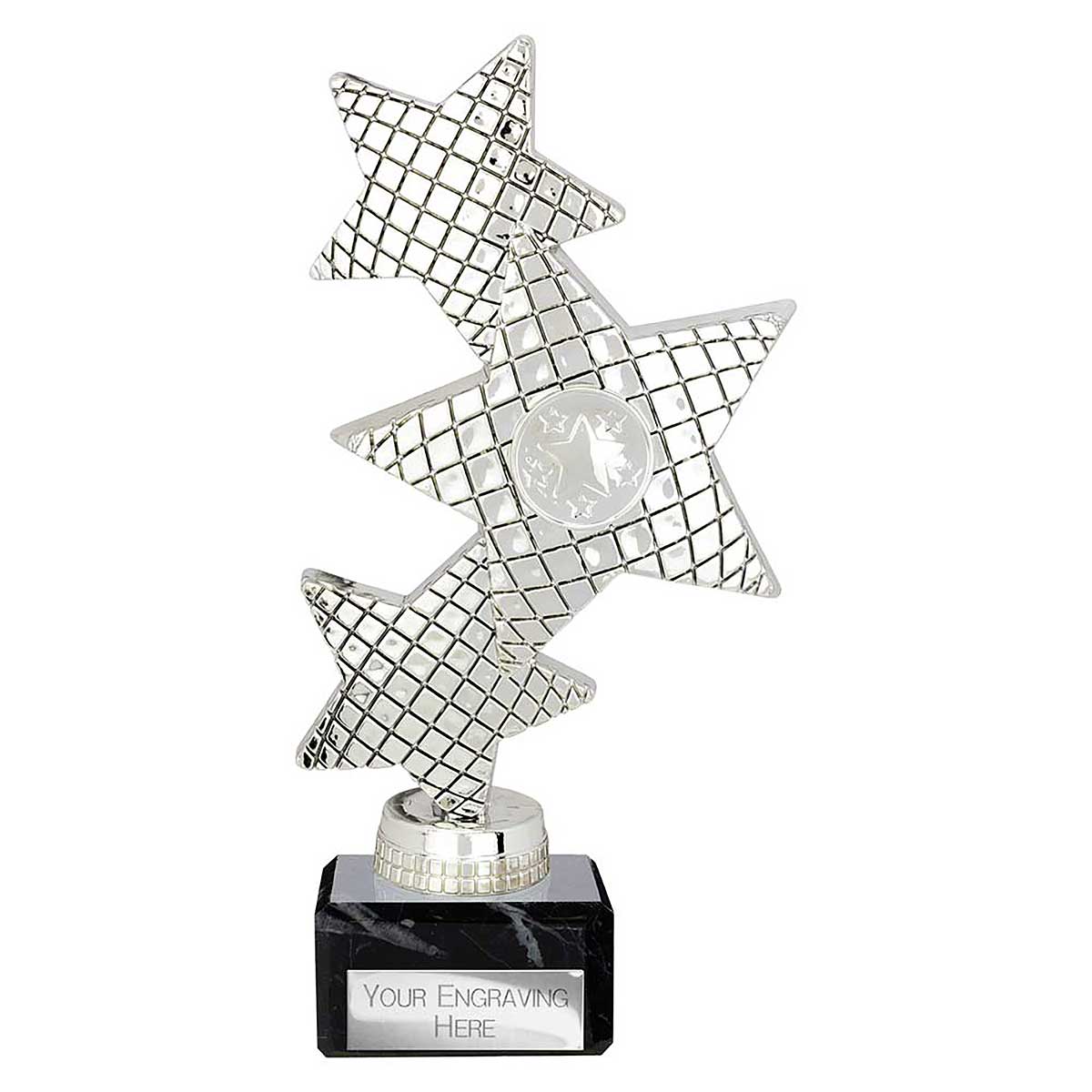 Silver Trinity Star Trophy 195mm highSilver plastic design on a black marble baseEngraving plate and club badge can be applied to the front