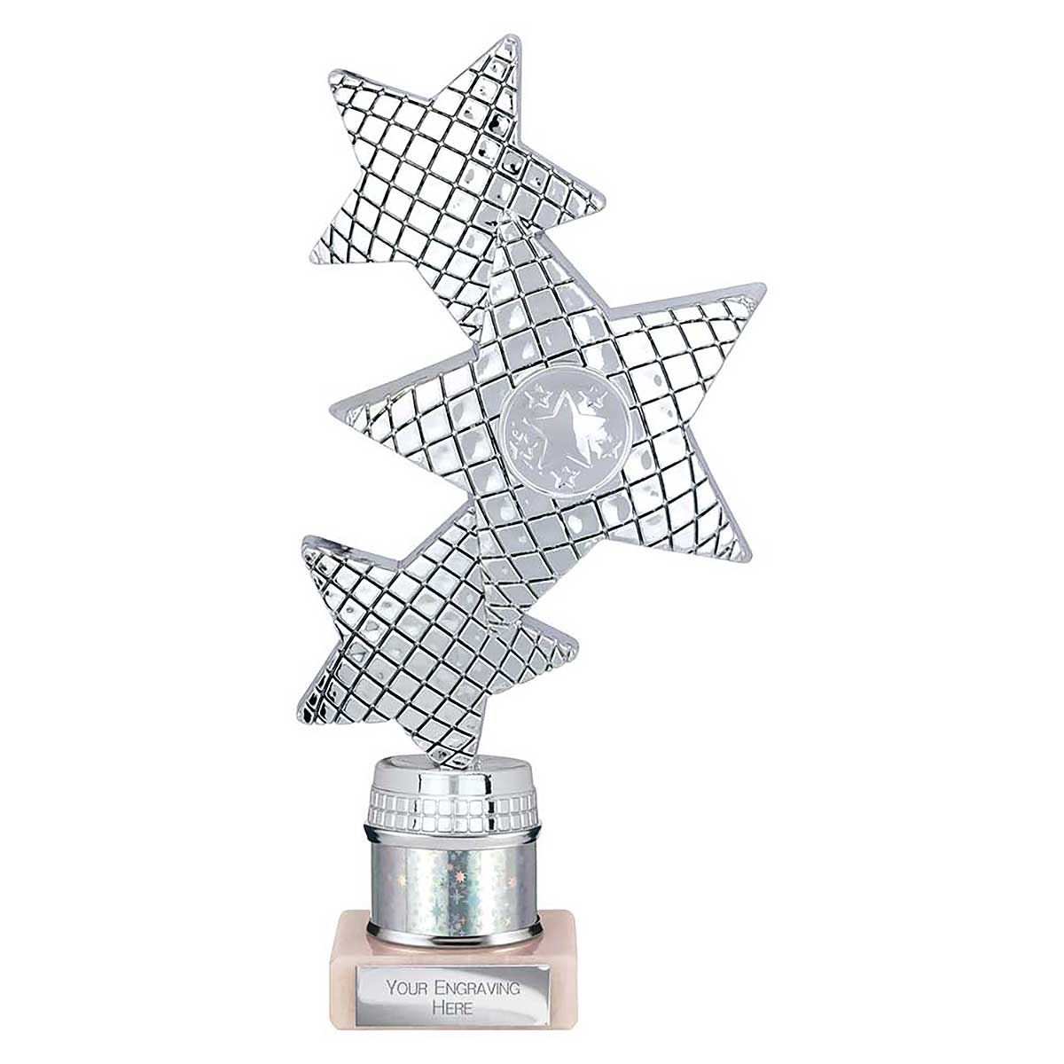 Silver Trinity Super Star Trophy 215mm highMoulded plastic design on a superstar sparkly column and stone baseEngraving plate and club badge can be applied to the front