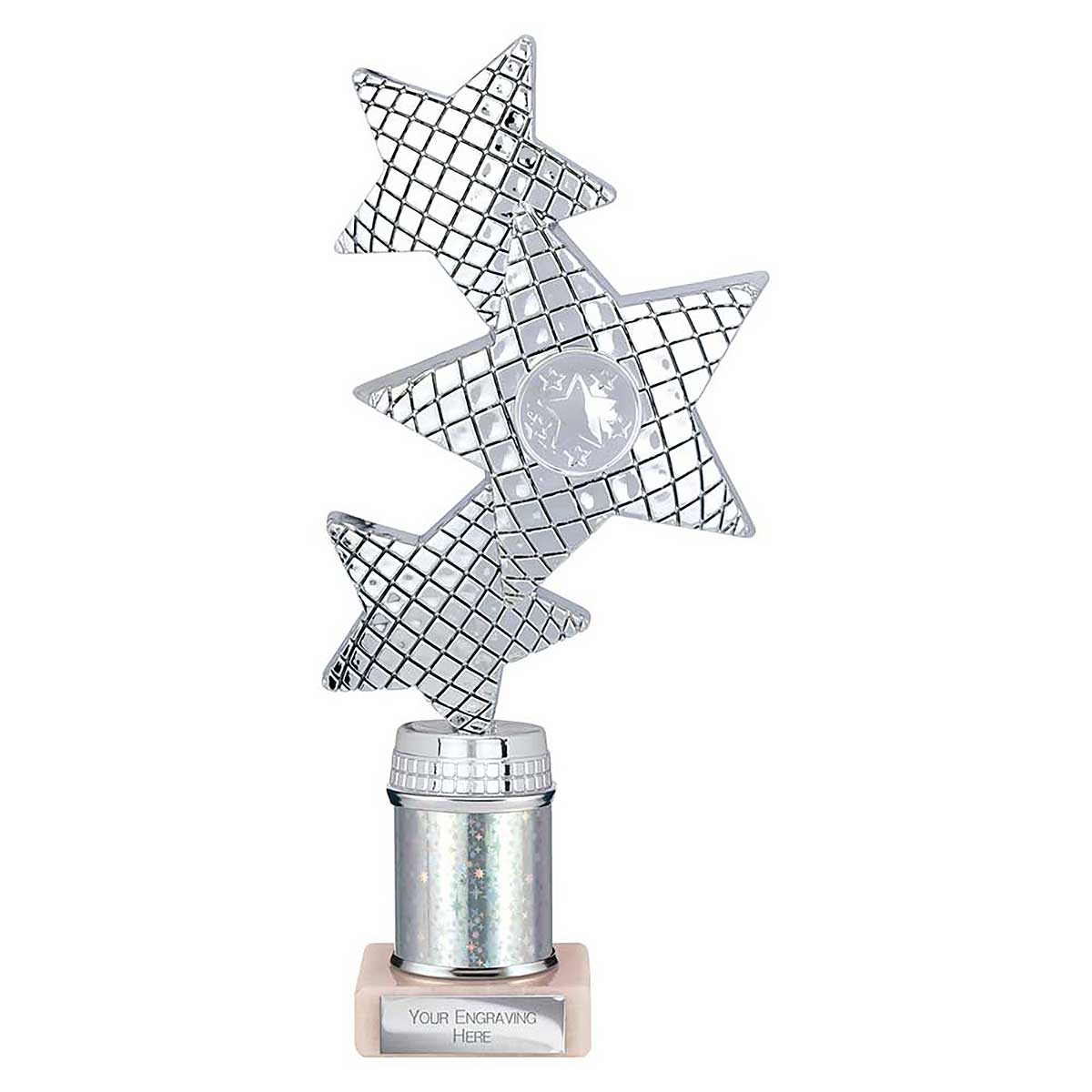 Silver Trinity Super Star Trophy 240mm highMoulded plastic design on a superstar sparkly column and stone baseEngraving plate and club badge can be applied to the front