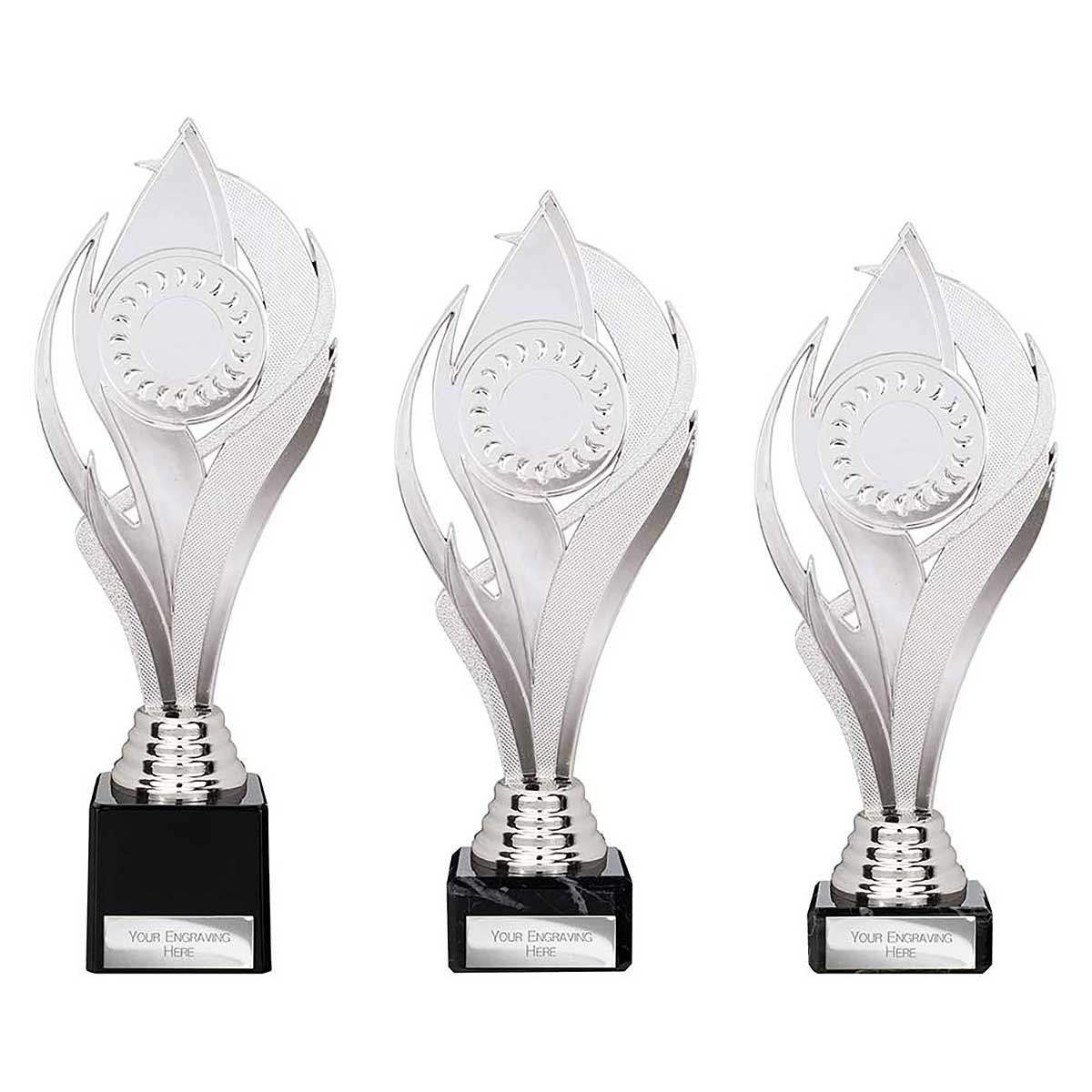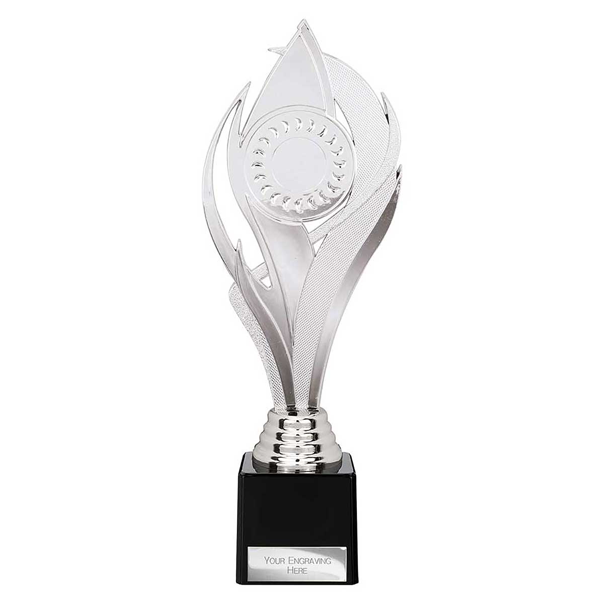 Silver Volcano Trophy 260mm highSilver plastic design on a black marble baseEngraving plate and club badge can be applied to the front