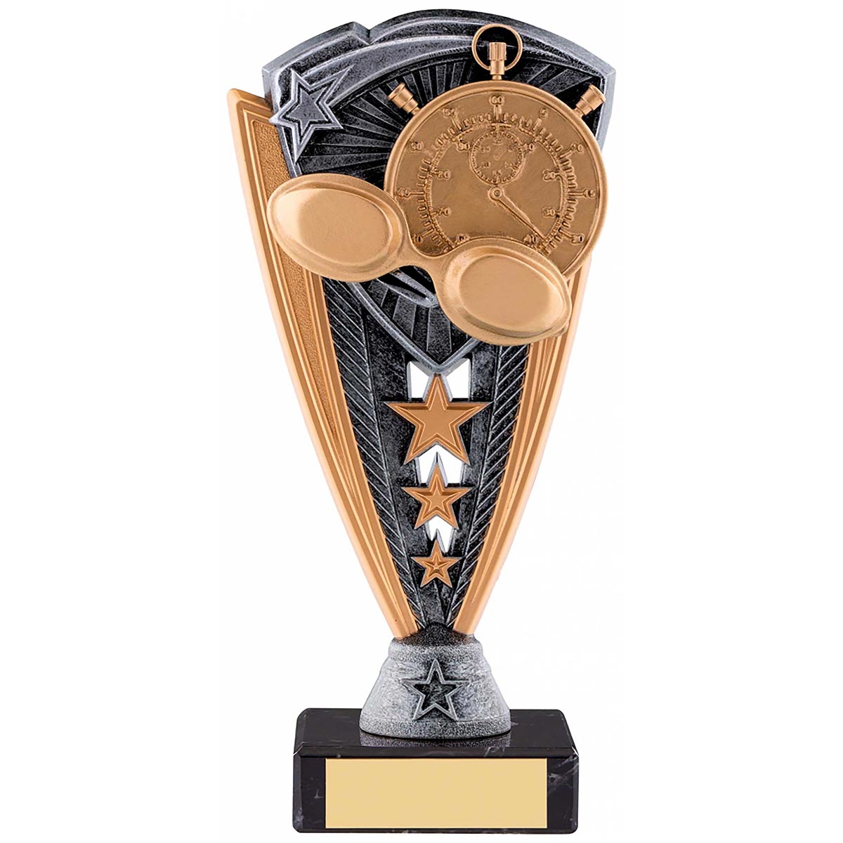 Utopia Holder Swimming Trophy 185mm highFeatures gold goggles and stopwatch on an antique silver and gold stand with gold star detailEngraving plate can be applied to front