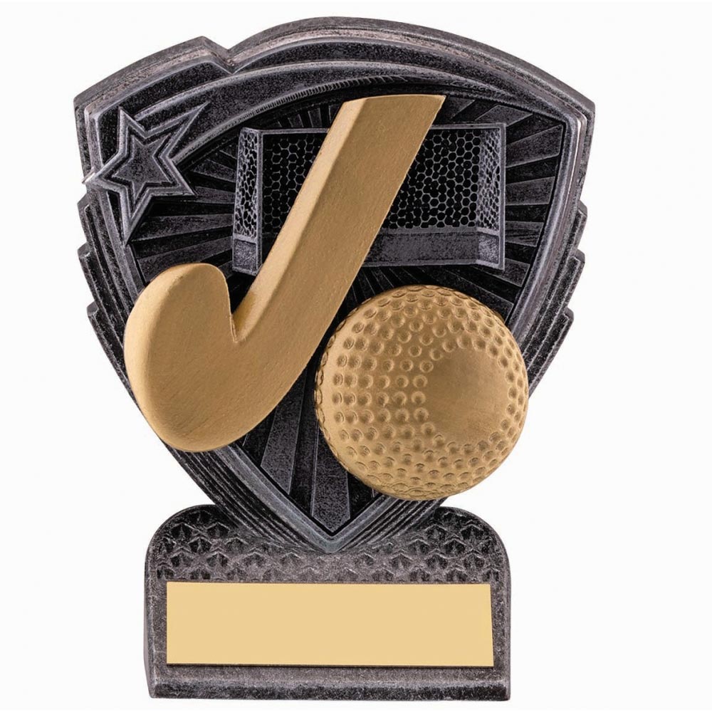 Utopia Mini Hockey Shield Trophy 10cm highFeatures ball andf stick in gold on an antique silver standEngraving plate can be applied to front